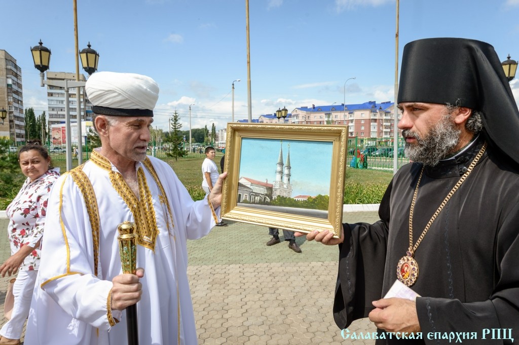 Перед началом торжественного приёма Владыка тепло приветствовал, поздравил муфтия Рамиль хазрата и преподнес в дар картину с изображением Четвёртой “Хакимовской” Соборной мечети города Уфы по улице Бекетовской (ныне ул. Мустая Карима, 11, бывшая ул. Социалистическая).