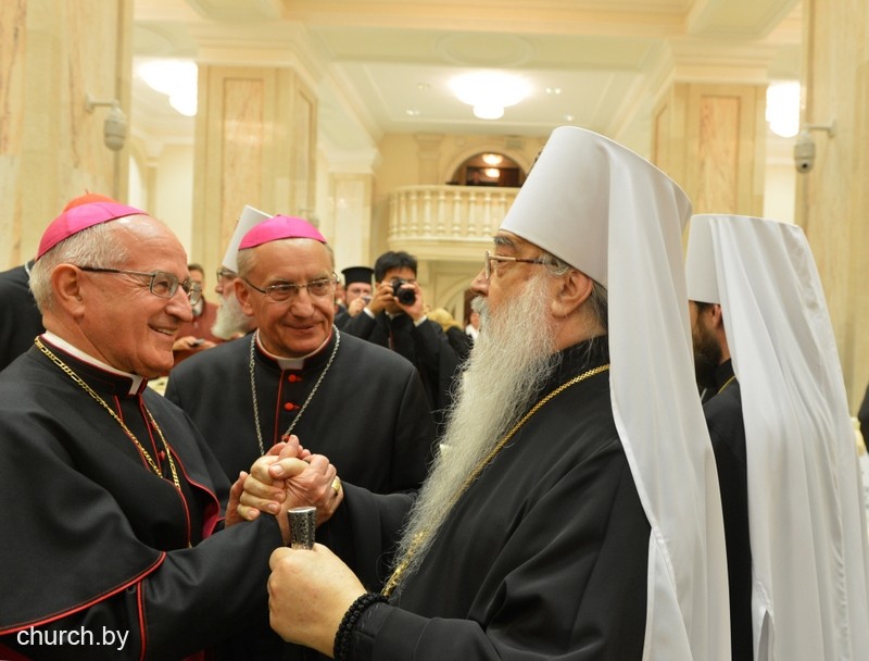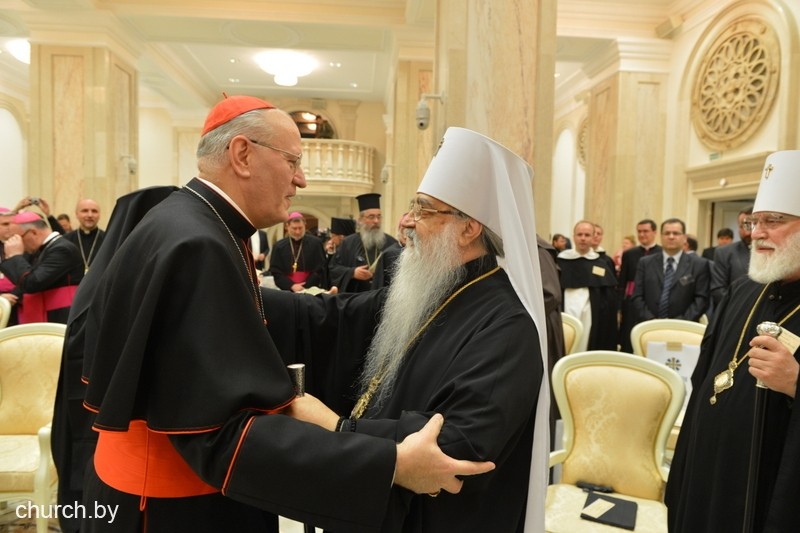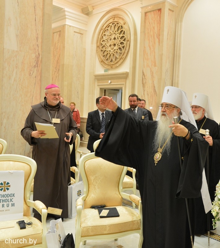 Собравшихся приветствовал почетный Патриарший Экзарх всея Беларуси Митрополит Филарет, который в 2012 году, являясь правящим архиереем Минской епархии, выступил с инициативой проведения православно-католического форума в белорусской столице.