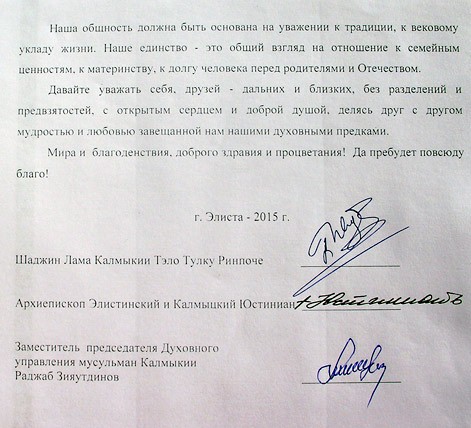 Обращение подписали Верховный лама Калмыкии Тэлу Тулку Ринпоче, архиепископ Элистинский и Калмыцкий Юстиниан и заместитель председателя Духовного управления мусульман Калмыкии Раджап Зияутдинов.