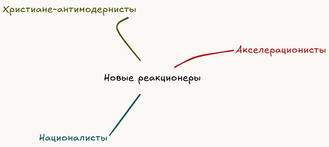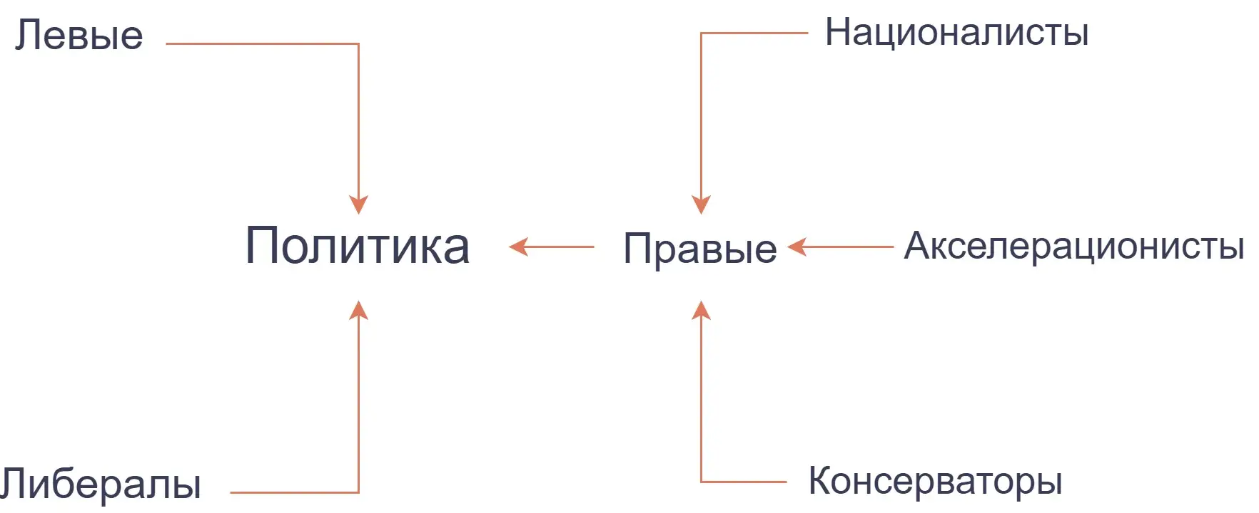 Далее мы наблюдаем, как правые делятся на более мелкие направления: националистов, акселерационистов и консерваторов.