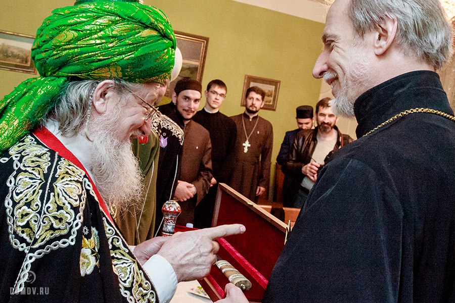 “теплая беседа исторической взаимосвязи между представителями христианской и мусульманской конфессий” … после которой “митрополит Игнатий вручил муфтию подарочный кинжал”… финиш….