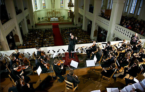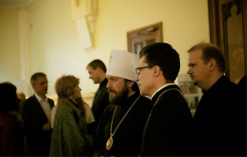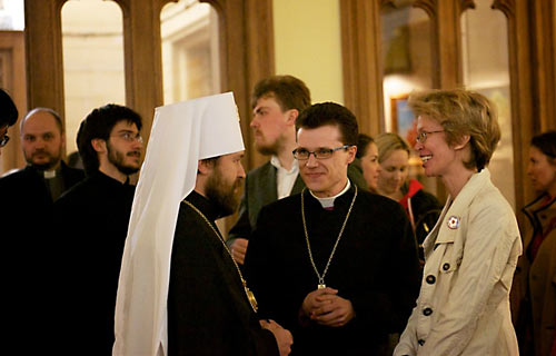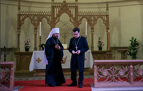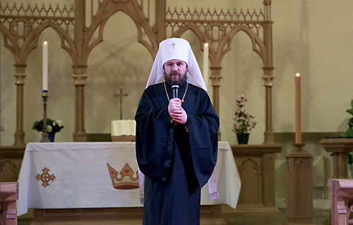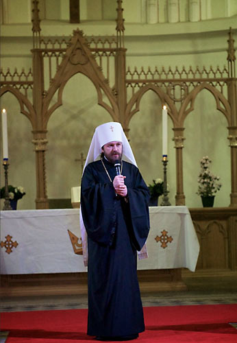 Лютеранский “епископ” Дитрих Брауэр в своем приветствии пожелал всем пришедшим исполниться Евангельской радости во время концерта, возблагодарил Господа за Его вдохновение и митр. Илариона за его искреннюю и живую проповедь Христа. Митр. Иларион обратился к собравшимся с пасхальным приветствием: «Христос воскресе!», а также подчеркнул в своей речи дружеские отношения между православными и лютеранами в России.